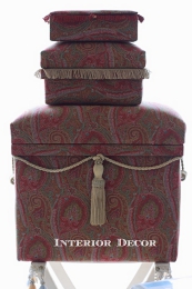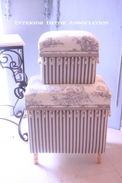 良質の杉板を材料に職人が丁寧に手作りで仕上げた茶箱に布やクッション材を貼り、装飾をほどこすことによって高級感がある収納BOXやスツールのような家具が完成します。
